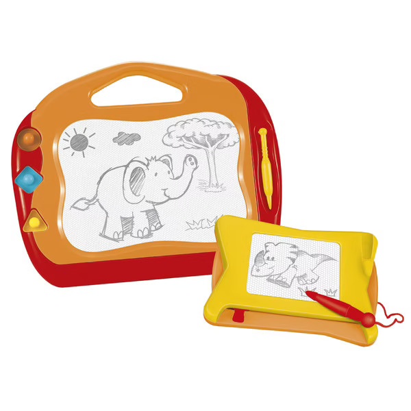 Write and draw on the board with the magic pen or with the stamps. Then move the small knob from side to side to erase and start again !